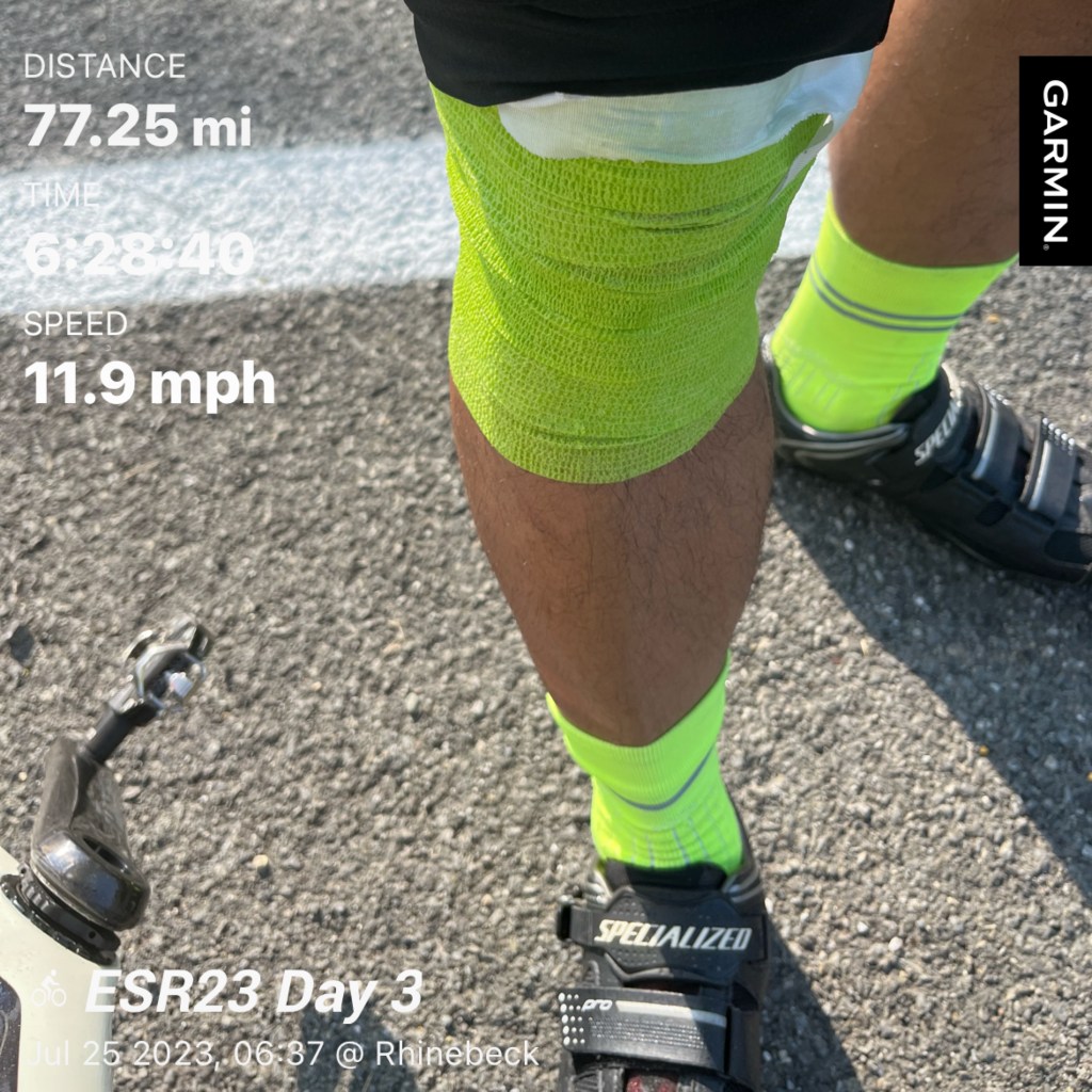 I couldn’t pedal uphill while seated on the saddle. So for next 10 miles, I put only about 10 percent effort with my right knee. At mile 20 was the first rest stop, an athletic trainer wrapped my knee and gave me some pain killers and topical pain spray.